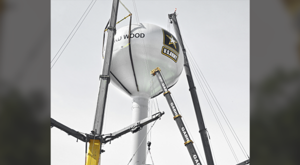 This 500,000-gallon sphere at one of our nation’s finest military bases needed a boost of additional pressure to better operate within the water system. Phoenix was contracted to raise this structure by 33’-9“. Our engineers devised a critical lift plan that used two hydraulic cranes to raise the tank, a third crane to add the new stem section, and a fourth crane for moving pieces about the site. This challenging operation was safely completed, and the cranes were released from the structure the same day that Phoenix crews worked to secure the new section in place.